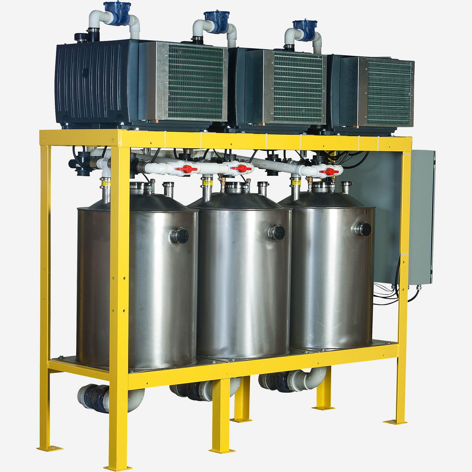 High Capacity fully redundant single frame factory assembled vacuum center consists of three 60 gallon T304 stainless steel waste collection tank, three 5 HP recirculating water sealed liquid ring vacuum pumps and a PLC driven automatic control panel.Product Function: