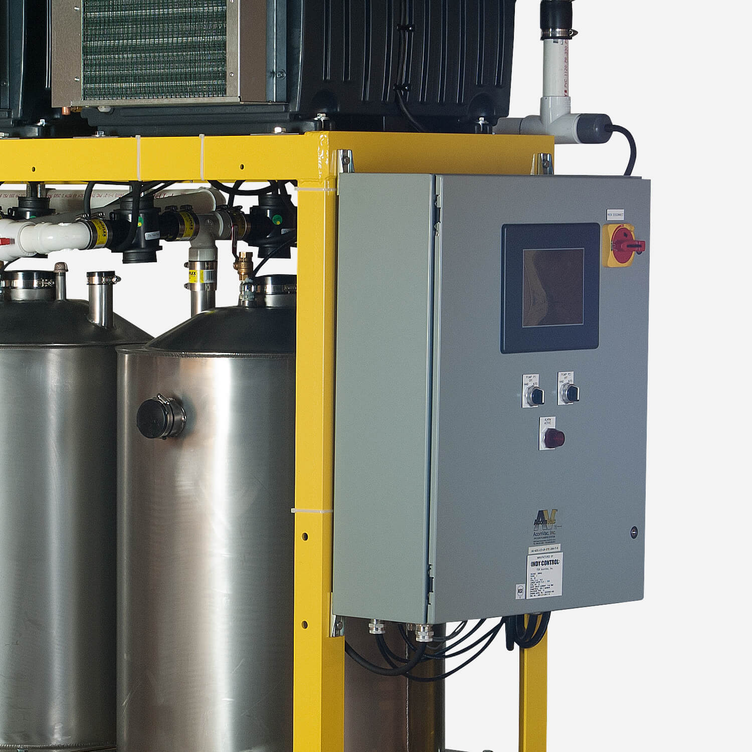 - Industrial grade panel has PLC driven automation control of vacuum pumps and waste collection and discharge cycles. Panel includes a main disconnect, an alarm light, HOA switches and an operator interface with digital display which shows vacuum system pressure and alarm status.