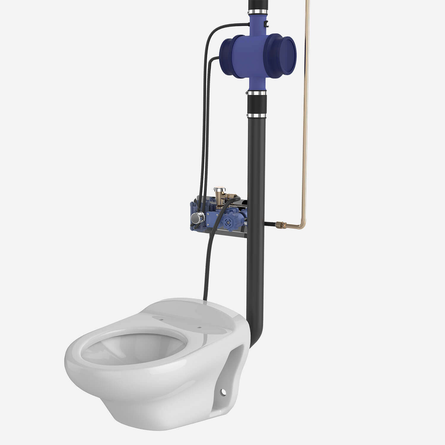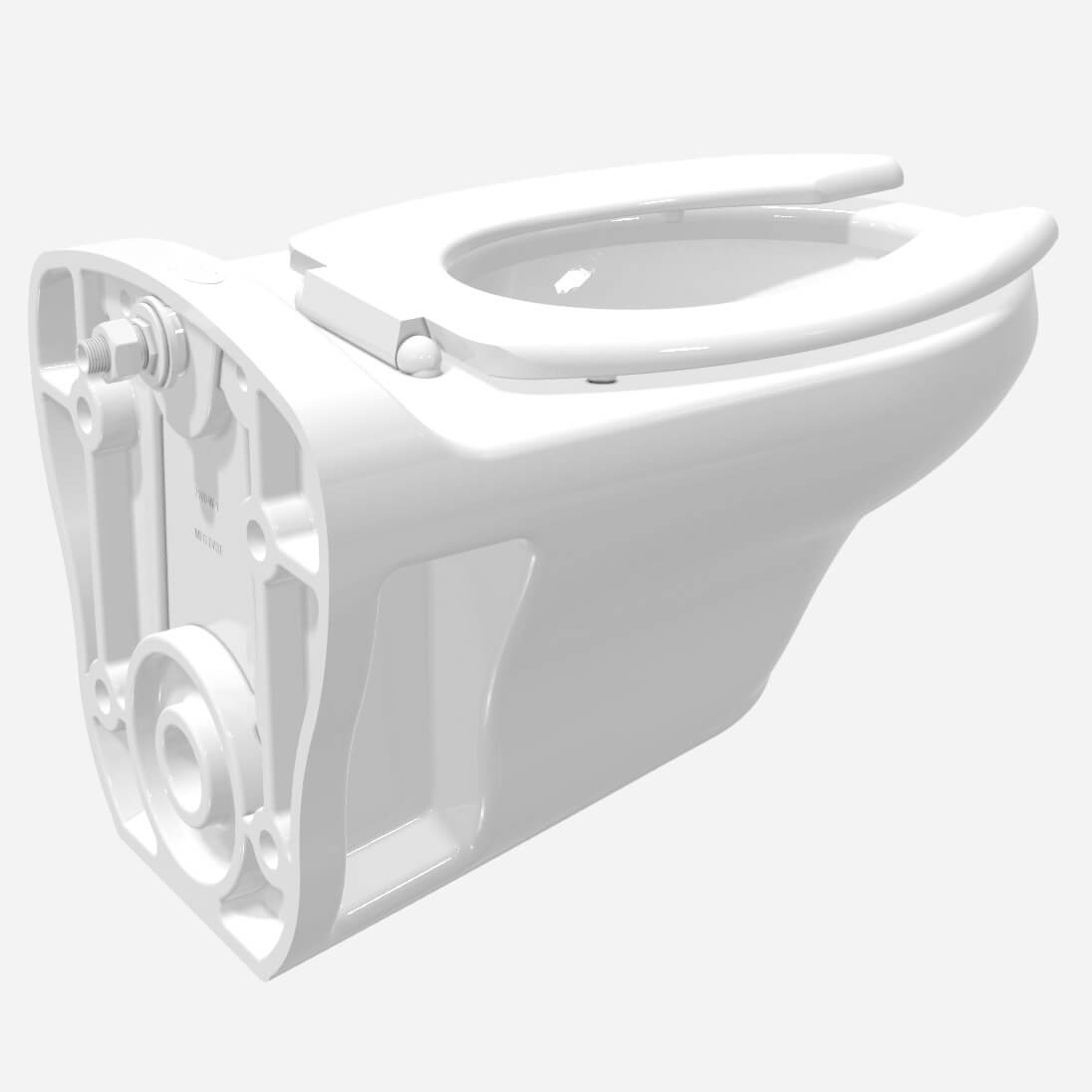 This toilet is designed to be wall-mounted off the floor for easy cleaning. The toilet features an elongated bowl. Wall Supply configuration is recommend for Acorn Vac installations. The vacuum system connects with the toilet's wall waste outlet.